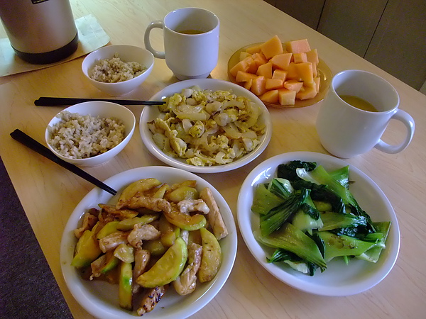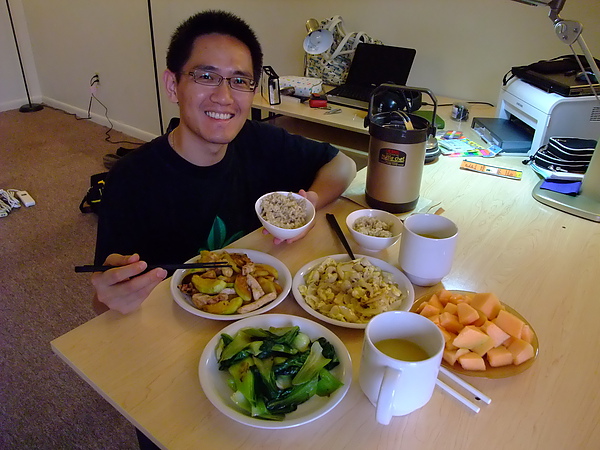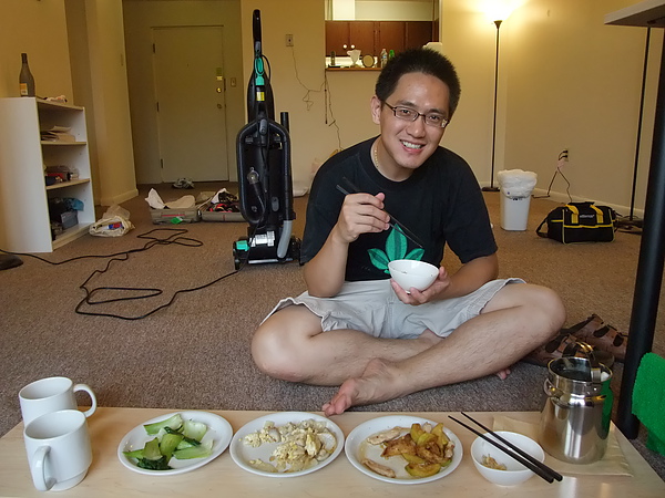 餐桌還沒買,先用書桌抵著先,站著吃一會,後來倆人就席地而坐了。大同電鍋還沒到,Chen-Hao 媽準備的小小悶燒鍋立即派上用場,果真粒粒熟透呢! 第一晚的米飯,是從家鄉帶來的糙米&水,說是這樣可以避免水土不服。