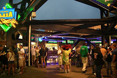老美看球賽,是不會一直在座位上觀賽的,雖然有小販在觀眾席來回穿梭叫賣零食飲料,但飲食區還是無時刻充斥著觀眾,尤其是在雨中等待復賽。大夥就像一場因球賽而聚在一起的party,不管認識不認識,也能扯上幾句。