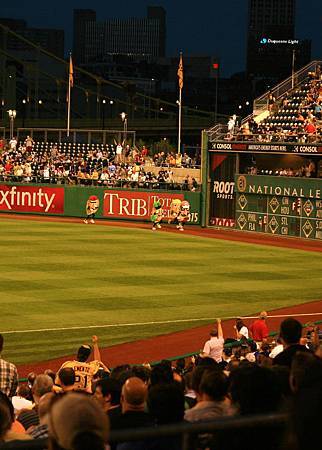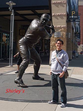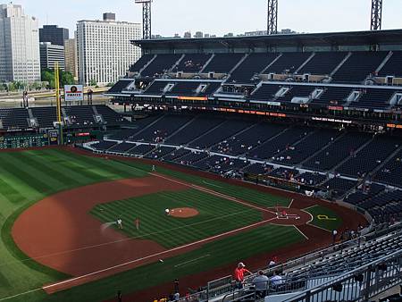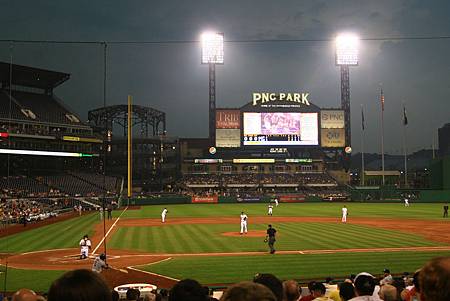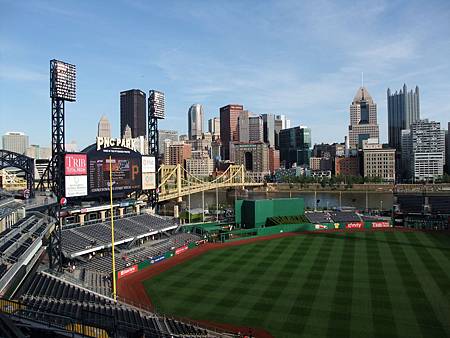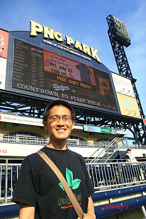 比賽是19:05分開始,但既然是大聯盟追星之旅,身為追星一族的Chen-Hao當然得盡責地成為17:30開放進場的第一批觀眾,興奮又灼熱的目光搜尋著球場上暖身的球員們,然而就是不見道奇56號(郭泓志)的身影,Chen-Hao跑來跑去從不同角度希望窺見道奇56號球衣,我則好整以暇地欣賞PNC Park的球場風光,球場傍著 Allegheny River而建,寬闊的視野剛好可將市區的摩天大樓群收入眼簾,雖說Pirates目前是支戰績墊底的鳥球隊,但球場的告示提醒著我們過往風華,她在七零年代前也曾拿下五次世界大賽冠軍(1909, 1925, 1960, 1971 & 1979),奈何就像 Pittsburgh 曾是風光的鋼鐵大鎮,Pirates 也在風華過後,試圖振作。