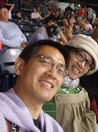PS: 後來我們回到旅館,因雨勢過大,確定這場比賽延賽了,還好我們只等了個把小時。順便附上大肚婆(31w1d)在球場外席地而坐照片一張,算是認真回應那些嚷著: 好久好久沒看到我的朋友們。也記念寶寶和我們一起經歷的第一場大聯盟球賽囉!!