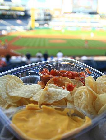 球賽本身固然重要,不過攻守交換間的娛樂也不能少,雖然都是一些初級娛樂,例如: 叫四個人扮成的玩偶比賽跑步給觀眾看,觀眾就會很配合地大呼小叫加油,然後就沒了。或者由球隊吉祥物拋丟點心棒或T-shirt給觀眾,一陣鼓譟你爭我奪後,然後就沒了。球場零食也是看球賽不可或缺的一環,這次點的Nacho搭配溫熱的起司醬與微涼的Sasa醬,讓人一口接一口,又提升了看球賽的享受等級,不過熱狗和爆米花就很普普了。