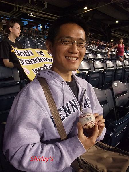 球員們暖身結束,還是不見56號,那好吧! 只好等著郭上場中繼的英姿囉。這場比賽有些沉悶,雙方得分不怎麼刺激,除了那突如其來的震撼消息,話說Chen-Hao前往餐飲區買熱狗時,竟從電視轉播中,聽到郭泓志在本日開賽前二十分鐘被宣布列入15天傷病名單,將先行返回洛杉磯,Chen-Hao眼裡的驚訝與失望真的藏都藏不住啊,這簡直是殘念到了極點,難怪賽前暖身我們遍尋不到郭的身影啊!! 可,我們明天(5/12)還有一場要看吶,這樣不是對Chen-Hao太殘忍了嗎? 大老遠開車過來,還押注兩場,結果郭竟然完全不會出現,這不就好像一把熱火被一注冰水狠狠灌下嗎? 但也還好,總是絕處逢生,大聯盟場地這麼大,何其幸運,五局上道奇投手擔任打擊,硬生生擊出一隻界外球,直朝Chen-Hao而來,彈跳後,掉落在我們前一排,我趕緊叫Chen-Hao跨過去撿球,不然Chen-Hao還愣著呢? 你問我,球直直飛過來,我不怕嗎? 嘿嘿...其實當下我正想著,我要不要去尿尿這件事,然後就看到球在眼前落下了,所以來不及怕。通常大聯盟轉播都會抓觀眾撿球的鏡頭,我們回到旅館也盯著轉播看,可惜,轉播把客隊道奇進攻的部分都切掉了,只轉播主場海盜的進攻,於是,我們沒得欣賞,有可能是Chen-Hao這一輩子唯一一次登上美國大聯盟轉播的機會啦!!!