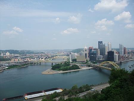 把 Pita Gyro 當開胃菜,再來一份左宗棠雞肉便當當主餐 (主餐比開胃菜便宜),配上自己準備的香蕉&蘋果,再拿 Creme Wafers 當甜點,而可樂&水隨伺在側,雖然極為平民,但還真覺得這頓午餐美味又氣氛,也或許是跟一般美式餐廳裡的食物比起來,任何食物都會未戰先得勝地變得美味吧!! 野餐後,時間還早,我們遂前往據說可以瀏覽 Pittsburgh 最佳天際線的 Mount. Washington,搭乘 DUQUESNE INCLINE (http://www.duquesneincline.org/)。前往纜車入口的街道上,旅人稀稀落落,一整排的餐廳,雖然都沒營業(也許剛好是人煙稀少的午后),仍可稍微想像一下她曾有的豐華。