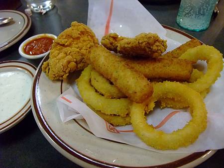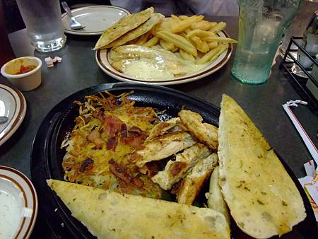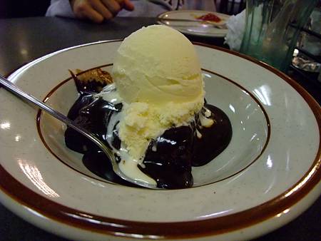 Dodgers vs. Prirates 以 2:0 結束球賽後,我們便駕車返回旅館休息,雖然觀看球賽過程,已經吃了許多零食,但總覺得還是要來些正餐,才能乖乖上床睡覺。恰好旅館 Days Inn 旁就有一家我們熟悉的二十四小時營業的 Denny's,點了兩人套餐,美國食物,沒甚麼特別的,不過,那熱布朗尼淋上巧克力醬,再加上冰淇淋,雖然甜的像是把不用錢的糖整包倒進去,但含進一口冰淇淋夾雜軟熱布朗尼,哎啊! 可也是一口接一口,邊喊甜卻邊全部進到肚子裡,尤其這陣子冰淇淋又恰恰特別吸引我,大滿足。離開 Denny's,已經晚間十一點多,但餐廳裡,可還是有客人呢!!
