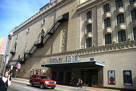 5/11(周三) 從旅館 Days Inn 午睡後進到市中心,利用進球場前的空檔,我們在PNC Park停好車,經 Roberto Clemente Bridge 散步到市區,如果我對New York 的街道似乎都很難有明顯的情緒起伏,那麼 Pittsburgh 這市區風光,看起來就更像路邊的幾棟普通摩天大樓了。走停走停,看著下班疾行的上班族,然後坐著乘涼,遇到 HEINZ Hall 就跟著路人也拍照一下 (Heinz 是總部設在 Pittburgh 的食品加工業,旗下最有名的便是番茄醬,占了全美一半以上的市場,但以我的經驗,到每一家餐廳,幾乎都是採用 Heinz家的番茄醬)。