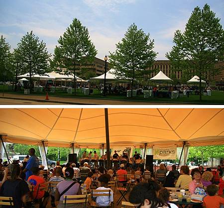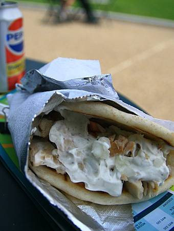離開 Cathedral of Learning,附近好幾片寬闊草地,剛好在舉辦第25屆的匹茲堡國際兒童節(5/11~15),搭著大大小小的白色棚子,我們拎著野餐盒找個地方坐下來午餐,除了一些附近的上班族也溜搭過來午餐外,果然到處都是兒童,推車裡的小嬰兒、還包著尿布的小小孩、正在團隊活動的十多歲大小孩...旋轉木馬(Carousel Rides)、臉部彩繪、音樂演奏、寵物區....etc.也夠小朋友嘻鬧歡樂一整天了。買了據說是來自希臘的 Pita Gyro,冷的Pita餅包裹熱雞肉,搭配番茄、洋蔥等生菜,再淋上酸甜的冷奶白醬 tzatziki ,實在是非常適合炎熱的夏天,開胃極了。我覺得 Gyro 其作法很像是來自土耳其的 Kebab,但我吃過的 Kebab都是熱的,因此覺得冷冷的 Gyro 別有一番味道。
