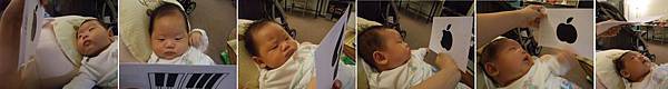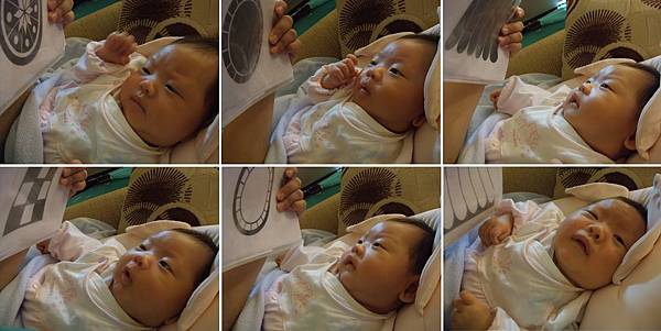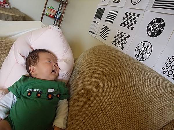 Ernie在1M21D時,我們第一次將卡片放到Ernie眼前,雖然持續力不久,盯著看許久後,略有不耐煩,但大抵可用聲音還有圖卡移動,再吸引他的注意力,或許他自己心裡頭想: 哇! 難得眼前有出現這麼清楚的咚咚 (我當然是不曉得他小腦袋瓜在想甚麼啦!)。不過,慢慢的,他的視線可以追著緩慢移動的圖卡。後來再慢慢地,發現躺在沙發上的Ernie會自己對著貼在牆上的黑白卡笑,於是,我們有時會讓他斜靠在沙發上抬頭看圖卡,有時會讓他坐在car seat上看牆壁的圖卡,大抵都能消磨一陣時光。