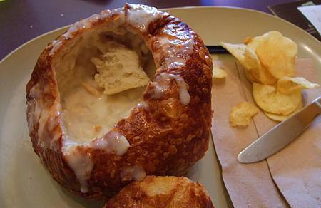 別小看這麵包湯,這可是我當了Ernie的娘後,第一次在咖啡館坐定下來,閒話家常啊,帶著Ernie的我穿梭在滿座的學生群中尋找座位,空氣中瀰漫著咖啡香與麵包香,還有鬧哄哄的學生味,益發感受到自己飄出的家庭主婦味,不知怎地,排隊等著點餐時,我有隱隱的興奮。只是,今天值得寫的,倒不是這麵包湯,而是和我一起去咖啡館的Rita。